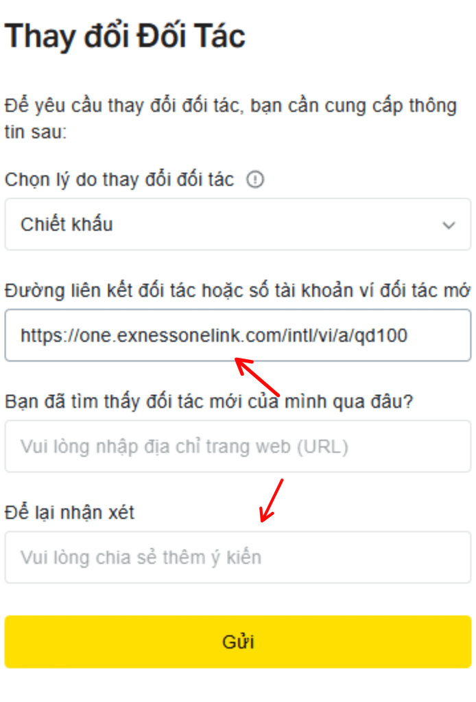 Bước 3: Tại hộp thoại Thay đổi đối tác, các bạn chọn Lý do thay đổi đối tác là “Chiết khấu”, tiếp theo, copy link đối tác này: https://one.exnessonelink.com/intl/vi/a/qd100 và dán vào ô Đường liên kết đối tác hoặc số tài khoản ví đối tác.